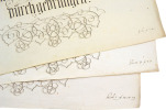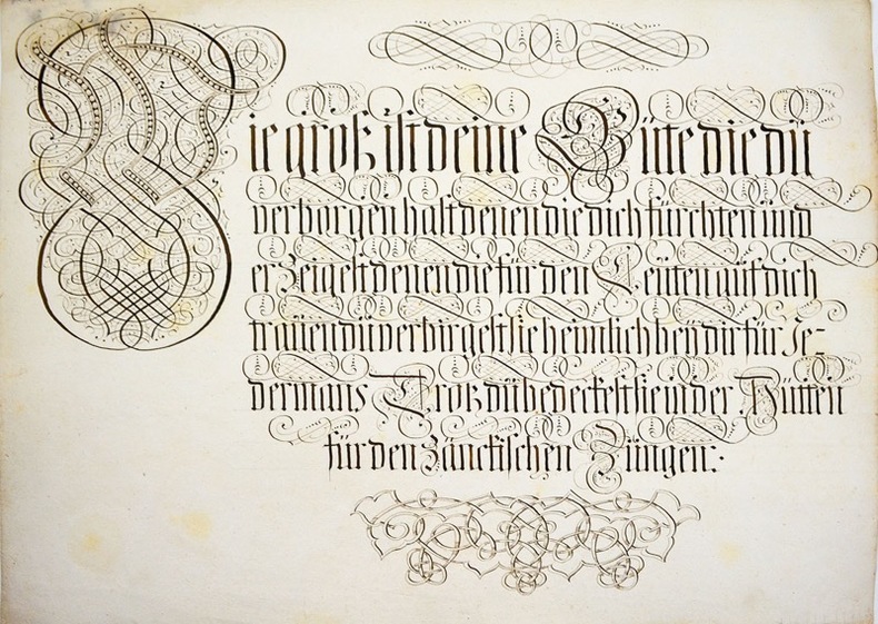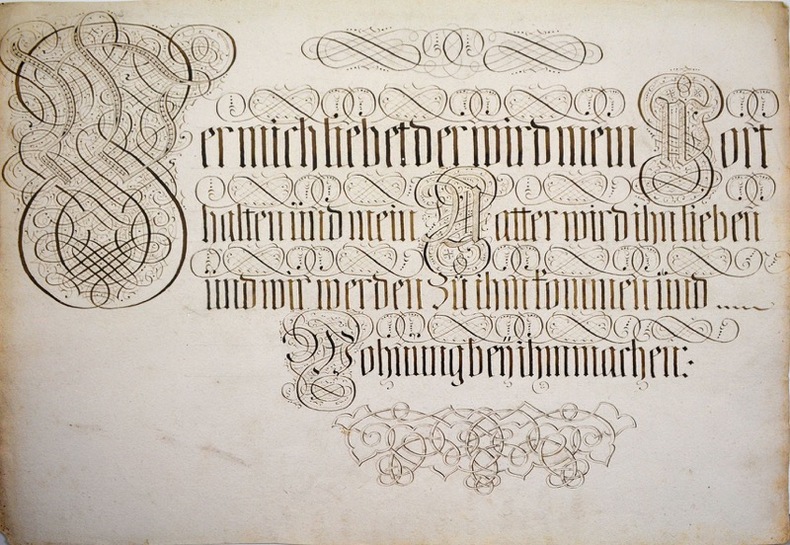 Ensemble de 19 grands feuillets manuscrits présentant un travail calligraphique à l'encre, avec lettrines ornées de volutes, bandeaux et décors ornementaux.Il s'agit de versets de la Bible, certains feuillets présentant des mentions manuscrites en bas à droite : Rom. 8 33, joh. 24, hiob. 17. 18. 19.Boite abimée avec manques au titre et frottements.