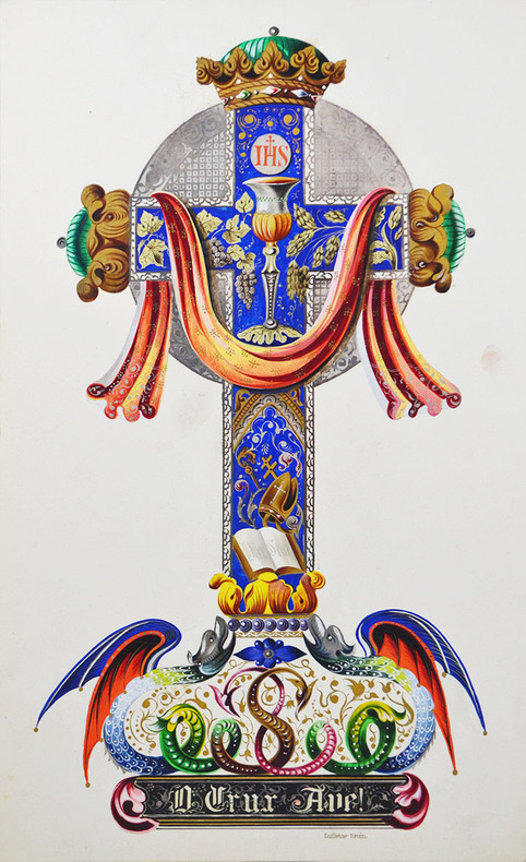 Composition religieuse décorative ornée d'une grande croix construite avec un assemblage d'ornements. Au centre : un calice eucharistique entouré de grappes de raisin et d'épis de blé, au dessus du calice, le monogramme IFS, en bas de la croix, un livre ouvert surplombé d'une mitre d'évêque.Avec la devise "In cruce Ave!" au pied de la croix.