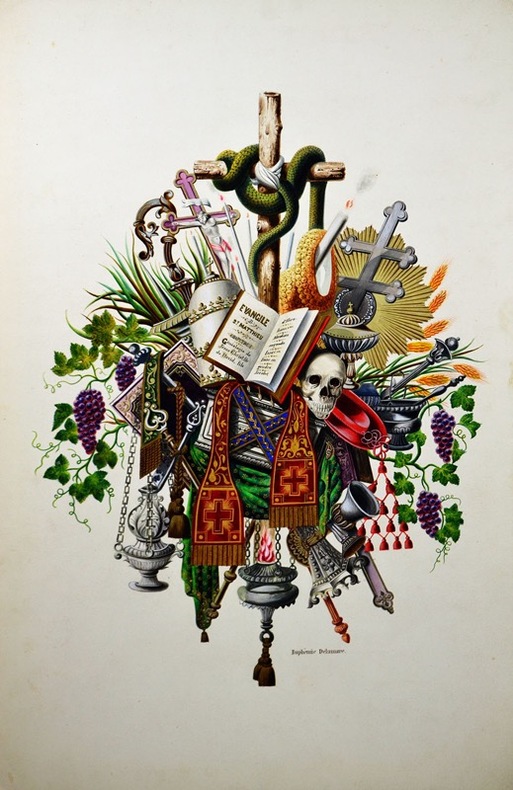 Enluminure représentant un trophée religieux orné d'un assemblage d'éléments liturgiques, eucharistiques, spirituels avec lesÉcritures au centre.Au vu du détail et de la finesse du travail, il pourrait s'agir de modèles pour des chromolithographies à destination d'ouvrages religieux.