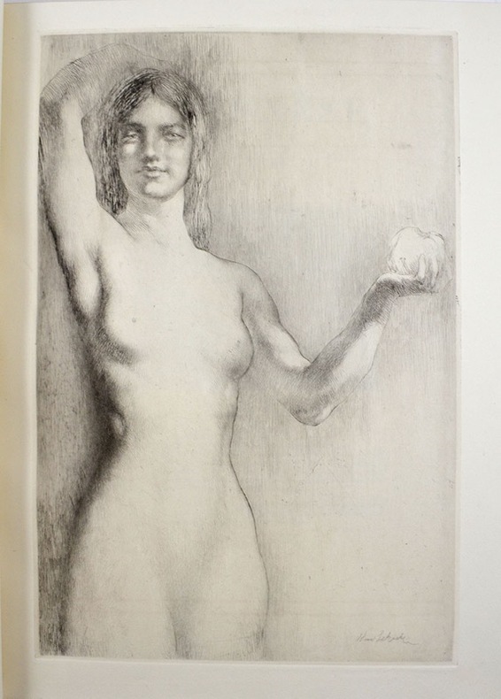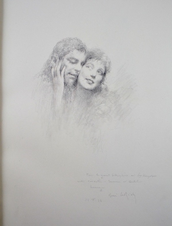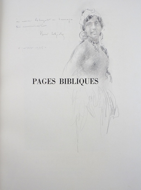 Puissante illustration comprenant 140 eaux-fortes originales d'Henri le Riche dont 71 à pleine page, illustrant des passages bibliques extraits de la Genèse. Lettrines gravées sur bois, texte encadré d'un filet carmin.Tirage unique à 100 exemplaires, celui-ci n°10 imprimé pour M. J. Exbrayat enrichi de deux envois de l'illustrateur au "grand bibliophile", et orné de deux dessins originaux à la mine de plomb, l'un une variante de la gravure de la p124 : Samson et Dalida, à pleine page, le second au faux-titre, une femme, Esther peut-être, portant un foulard sur la tête, des créoles et la poitrine dénudée."Très belle publication côtée et abondamment illustrée ; c'est une des meilleures illustrations de l'artiste".Superbe exemplaire dans une reliure de Fernand Gampert, relieur suisse, ami de Christian Dior.Monod, 8821. Carteret, IV, 310. Un étui est présent mais cassé.