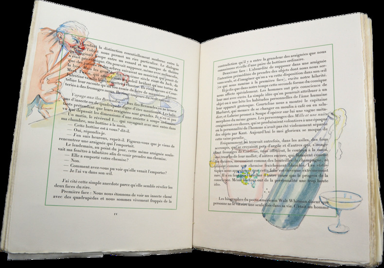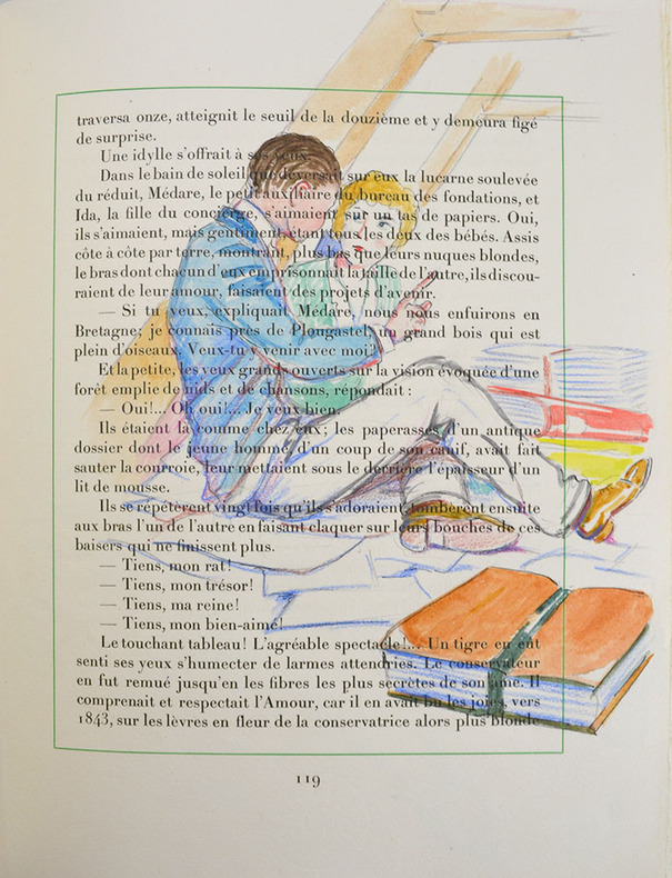Ouvrage illustré de 15 aquarelles de SEM reproduites par Daniel Jacomet.Tirage à 590 exemplaires. Cet exemplaire sur vélin d'Arches est non numéroté. Exceptionnel exemplaire enrichi de 154 grands dessins originaux à l'encre, mine de plomb et aquarelle illustrant chaque page, en marges mais principalement sur le texte mais ne gênant pas la lecture. Elles sont protégées par des serpentes.16 d'entre eux sont à pleine page sur des feuillets blancs, compris dans la pagination, au dos des en-tête de chapitres. Seules quatre pages n'ont pas de dessins, souvent des têtes de chapitre laissées vierges. Les dessins ne sont pas signés mais de belle qualité. Ils reprennent l'esprit de l'ouvrage. Ils pourraient être attribués à Théodore Van Elsen, proche de la maison d'édition Javal et Bourdeaux et de Mr Dumouchel administrateur de la maison d'éditions. Ce dernier avait déjà fait truffé d'autres exemplaires de cet ouvrage.Est-ce un projet d'illustrations concret ou le simple plaisir d'un bibliophile de l'époque? Sans signature et sans mention, l'interrogation demeure. Manque l'une des deux attaches de la boite.