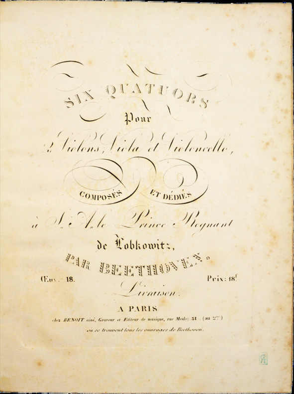 Paris, chez Benoît Ainé (pour les quatuors 1 à 9) et chez Maurice Schlesinger (quatuors 10 à 17), s.d. [Circa 1827]. 8 vol. grand in-4. Demie basane bleue, dos lisses ornés de quadruples filets et lettrines dorées, étiquettes de titre de maroquin rouge contrecollée au premier plat pour les quatuors 1 à 9.