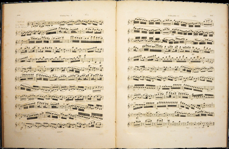 Rare ensemble des partitions complètes des 17 quatuors à cordes composés par Beethoven entre 1798 et 1826.Elle comprend les six quatuors de l'opus 18 composés entre 1798-1800, les cinq quatuors centraux (les trois « Razumowsky », opus 59, 74 et 95 composés entre1805 et 1810), complétés par les cinq derniers quatuors et la Grande Fugue des années 1822-1826. Les 8 volumes composant l'ensemble présente chacun la partition d'un des instruments avec lesquels la suite est destinée à être jouer (2 Violons, Viola et Violoncelle), les 4 premiers volumes correspondant aux partitions des quatuors 1 à 9, les quatre derniers aux quatuors 10 à 17.Émouvant exemplaire de la bibliothèque d'Alfred Cortot (1877-1962), avec son ex-libris et son cachet à la page de titre. Pianiste et chef d’orchestre franco-suisse,il est considéré comme l’un des plus grands interprètes de la musique romantique, en particulier de Chopin, Schumann et Liszt. Il était aussi un pédagogue influent,cofondateur de l’École Normale de Musique de Paris en 1919.Dos insolés, épidermures et frottements aux dos, légères griffures sur les plats.Quelques rousseurs, sans gravité.Détail des livrets :Op. 18 (quatuors 1- 6) et Op. 59 (quatuors 7 - 9) :- vol 1 : Premier violon : [1] f, 1 f. (titre : six quatuors), de 64 à 105 pp. (quatuors 1 à 6 dédiés au Prince de Lobkowitz, Œuv. 18. n°8 à 13) ; [1] f blanc, 1 f. (titre : trois quatuors), de 106 à 128 pp. (quatuors 7 à 9 dédiés à Son Excellence Mr le comte de Razumovsky, Op. 59. n°14 à 16). 2 pages de titre avec mention manuscrite : n°1 et n°3. Sans la page de titre de la livraison n°2 concernant le quatuor 8, avec un feuillet blanc de séparation.- vol II : Second violon : [1] f, 1 f. (titre, avec mention de 2e livraison), de 8 à 70 pp. (quatuors 1 à 9), [1] f.- vol III : Alto : [1] f, de 51 à 115 pp.- vol IV : Violoncelle : [1] f, de 44 à 105 pp, [1] f.Op. 74, 95, 127, 130, 131, 132, 135, 133 (Quatuors 10, 11, 12, 13, 14, 15, 16 et 17) :- vol V : Premier violon : [1] f, 1f. titre (10e quatuor), 1 p. (catalogue thématique), de 82 à 91 pp. (10e quatuor) ; 1f. titre (11e quatuor dédié à son ami de Domanaveti),de 92 à 99 pp. ; [1] f, 1 f. titre (12e quatuor dédié au prince Galitzin - cachet Brandus & Dufour), de 100 à 115 pp ; [1] f, 1 f. titre (Treizième quatuor dédié à Nicolas de Galitzin, , Œuv. 130, étiquette contrecollée de l'éditeur Fillastre à Bordeaux), de 116 à 131 ; [1] f titre (14e quatuor : grande fugue dédiée à son Altesse Impériale le Cardinal Rodolphe, Opéra 133), de 132 à 139 pp. , [1] f, 1f. titre (15e grand quatuor dédié Nicolas de Galitzin, Œuv. 127) de 140 à 151 pp. , 1f. titre (16e grand quatuor dédié au Baron de Stutterheim, cachet Brandus & Dufour), de 152 à 165 pp. , [1] f, 1f. titre (17e quatuor dédié à son ami Jean Wolfmeyer, Op. 134, cachet Brandus & Dufour), de 166 à 177 pp. , [1] f.- vol VI : Second violon : [1] f, de 68 à 153 pp., [1] f. (quatuors 10 à 17).- vol VII : Violoncelle : [1] f, de 66 à 149 pp., [1] f. (quatuors 10 à 17).- vol VIII : Viola : [1] f, 64 à 147 pp., [1] f. (quatuors 10 à 17).