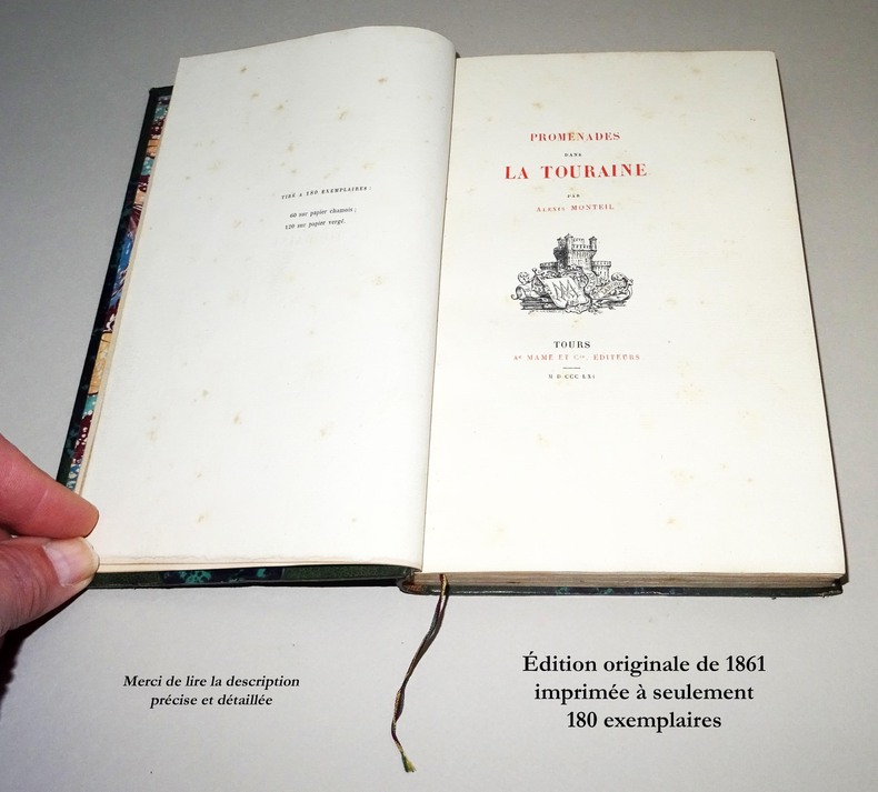 Alexis MonteilPromenades dans la TouraineTours, mame, 1861, XVI & 205 pp.Prince Augustin GalitzinQuelques lettres de Henry IV relatives à la TouraineTours, Mame, 1860, 76 pp.Soit Deux ouvrages, tirés à 120 exemplaires uniquement sur papier vergé, dans une reliure demi-vélin (bords frottés), intérieur frais, non rogné.Fort rare