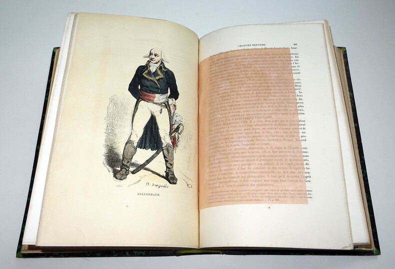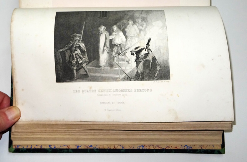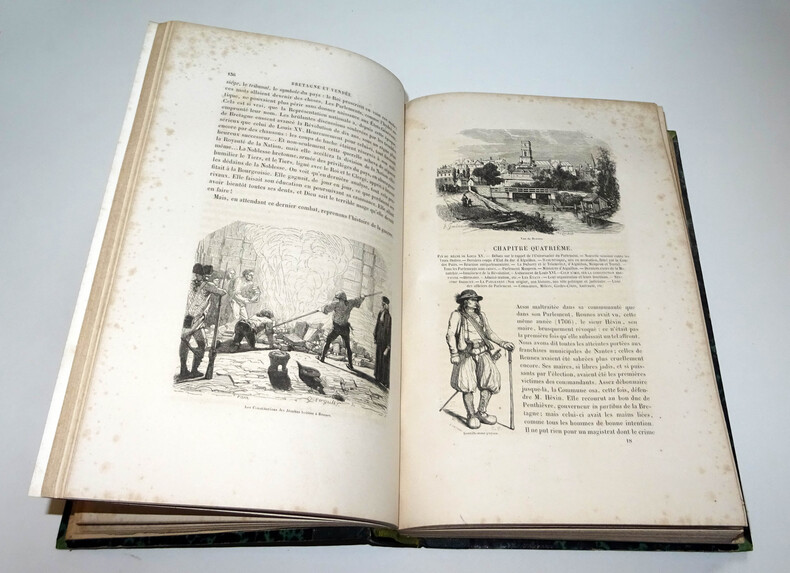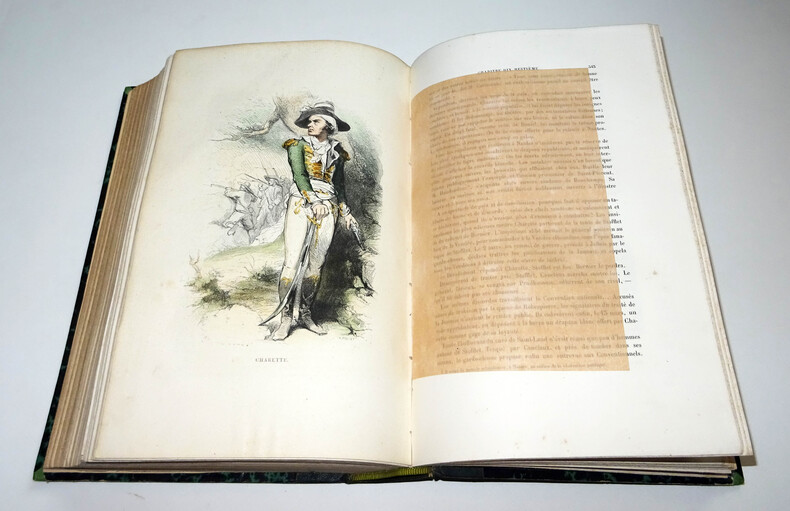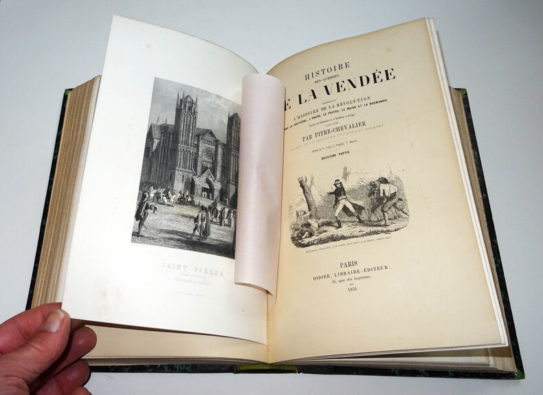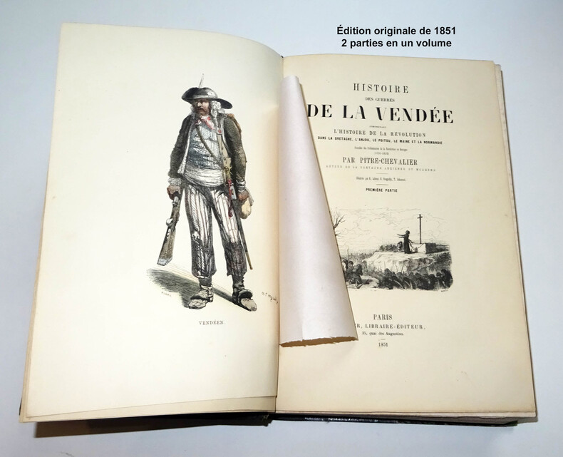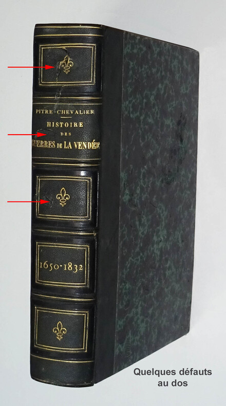 Paris, éd. Didier, 1851, EDITION ORIGINALE, demi-chagrin noir, plats percaline chagrinée brun clair avec filet doré entre le dos et les plats, encadrements, auteur, titre et initiales (F. H.) dorés sur dos à 4 nerfs, reliure d'époque, 648 pp., ill. par 12 planches lithographiées coul. dont 1 en frontispice et 20 planches en noir sur carton fort,sous serpente, 1 carte en coul., très nb. gravures en noir in-texte par A. LELEUX, O. PENGUILLY et de T. JOHANNOT, appendice, table des matières, EX-LIBRIS en vert et jaune de l'historien François FURET collé sur la première garde ainsi que son cachet violet sur la première blance, Pierre-Michel-François Chevalier dit « Pitre-Chevalier » est un auteur, historien et journaliste français né le 16 novembre 1812 à Paimbœuf (Loire-Inférieure) et mort à Paris le 15 juin 1863. Il a été rédacteur en chef du Figaro et directeur du Musée des familles. Comme le titre l'indique bien, ce livre est l'histoire de cette partie de la France restée loyaliste et combattant la Révolution et l'Empire. Très bon document avec de très nombreuses références pour bien comprendre cette période dans ces régions de l'Ouest. Ce livre faisait partie de la bibliothèque personnelle de François Furet, avec son ex-libris. François Furet, né le 27 mars 1927 à Paris, mort à Figeac le 12 juillet 1997, est un historien français, spécialiste de la Révolution française et de son héritage idéologique. Il appartenait à une génération d'intellectuels cherchant dans les faits les raisons de la faillite du projet marxiste. Pas courant en Edition Originale. Très bon état de la reliure; comme dans tous les exemplaires présence de rousseurs mais épargnant des planches couleurs.