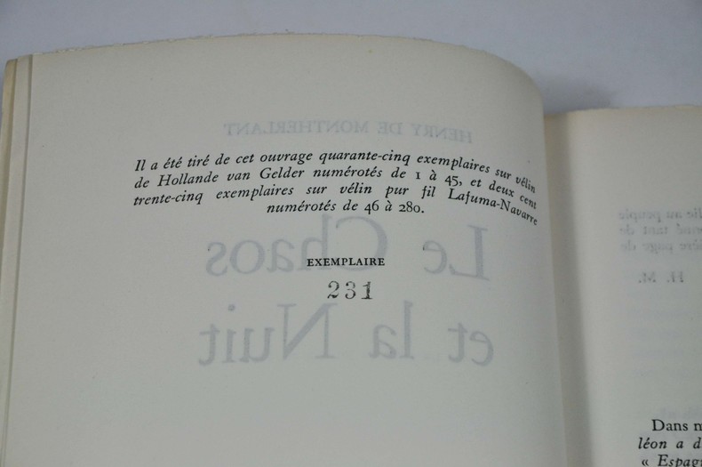 Paris Editions Lidis / Imprimerie Nationale 1963 in folio (28,5x22) 8 volumes brochés, couvertures rempliées, 248, 183, 227, 177, 209, 349, 385 et 218 pages; chemises et étuis de l'éditeur (dos de cuir rouge ornés d'un semis d'étoiles dorées). Ouvrages ornés de nombreuses lithographies originales en couleurs de Clairin, Bardone, Spitzer (2), Trémois, Zendel, Montané (2). Tome 1: Le songe, 8 lithographies originales en couleurs de Pierre-Eugène Clairin (dont 1 sur double page), 248 pages. Tome 2: Les olympiques, 6 lithographies originales en couleurs de Guy Bardone (dont 1 double page), 183 pages. Tome 3: Les bestiaires, 8 lithographies originales en couleurs de Walter Spitzer (dont 1 double page), 227 pages. Tome 4: La petite infante de Castille - Encore un instant de bonheur, 6 lithographies originales en couleurs de Pierre-Yves Trémois (dont 1 double page), 177 pages. Tome 5: Les célibataires, 8 lithographies originales en couleurs de Gabriel Zendel (dont 1double page), 209 pages. Tome 6: Les jeunes filles - Pitié pour les femmes, 10 lithographies originales en couleurs de Roger Montané (dont 2 doubles pages), 349 pages. Tome 7: Le démon du bien - Les lépreuses, 12 lithographies originales en couleurs par Roger Montané (dont 2 doubles pages), 385 pages. Tome 8 : Le chaos et la nuit, 8 lithographies originales en couleurs par Walter Spitzer (dont 1 double page), 218 pages. Tirage limité, celui-ci un des 3500 exemplaires numérotés sur vélin Vercors filigrané à la signature de Henry de Montherlant. Ensemble en très bel état ( Photographies sur demande / We can send pictures of this book on simple request )