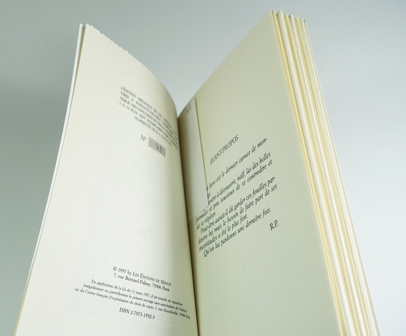 Les Editions de Minuit, 1997. In-12 broché, 92 p. Edition originale. L'un des 79 exemplaires numérotés sur vergé des papeteries de Vizille, seul grand papier. Très bel exemplaire, non coupé.