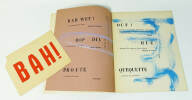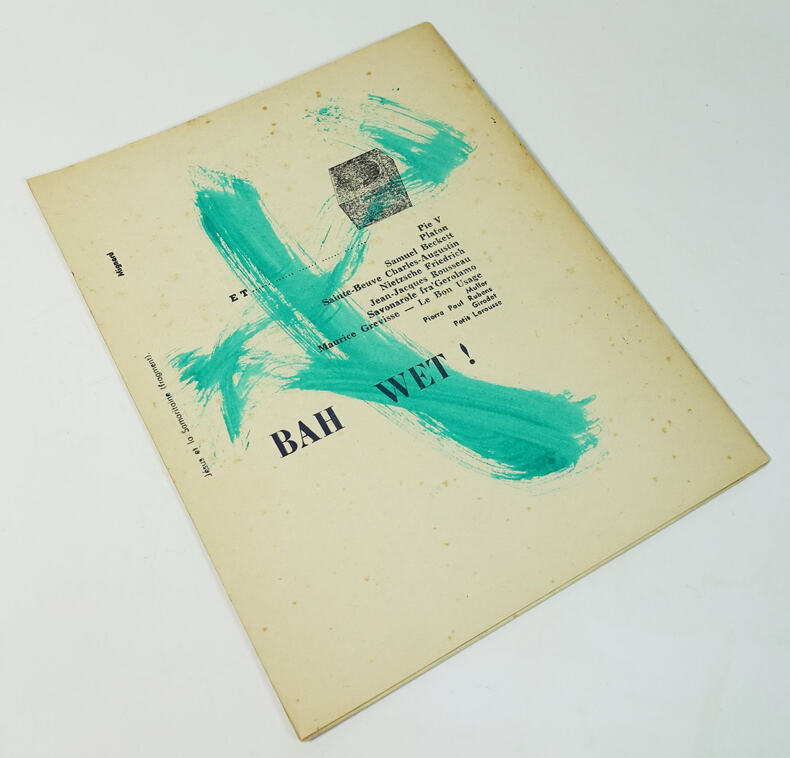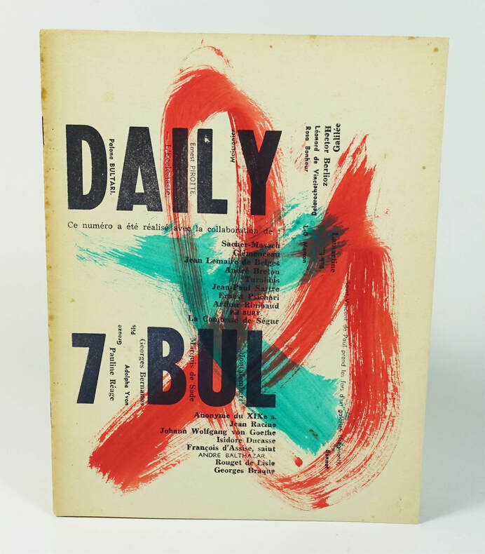 Numéro 7, septembre 1958. Revue belge poste-surréaliste se déclarant "Moniteur de la pensée Bûl et de l'Académie de Montbliart", dirigée par Pol Bury et André Balthazar. Citations de Sacher-Masoch, André Breton, Jean-Paul Sartre, Arthur Rimbaud, Goethe, Isidore Ducasse, Georges Bernanos, Lamartine... détournées et commentées par Balthazar, Bury, Pirotte et comparses par des interventions originales en couleurs et 2 collages rendant chaque exemplaire unique. [16 pp.] >BEL EXEMPLAIRE Très bon exemplaire 0