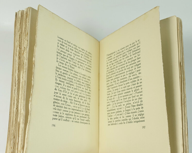 1929 nrf gallimard 1929 - in 8 Bradel plein papier pièce de titre chagrin rouge (reliure Armelle Guégant) 235 pages - seconde édition, 1 des 105 exemplaires sur velin - 1 portrait ajouté, il s'agit du portrait de Max Jacob par Man Ray provenant de l'édition originale de l'homme de chair et l'homme reflet