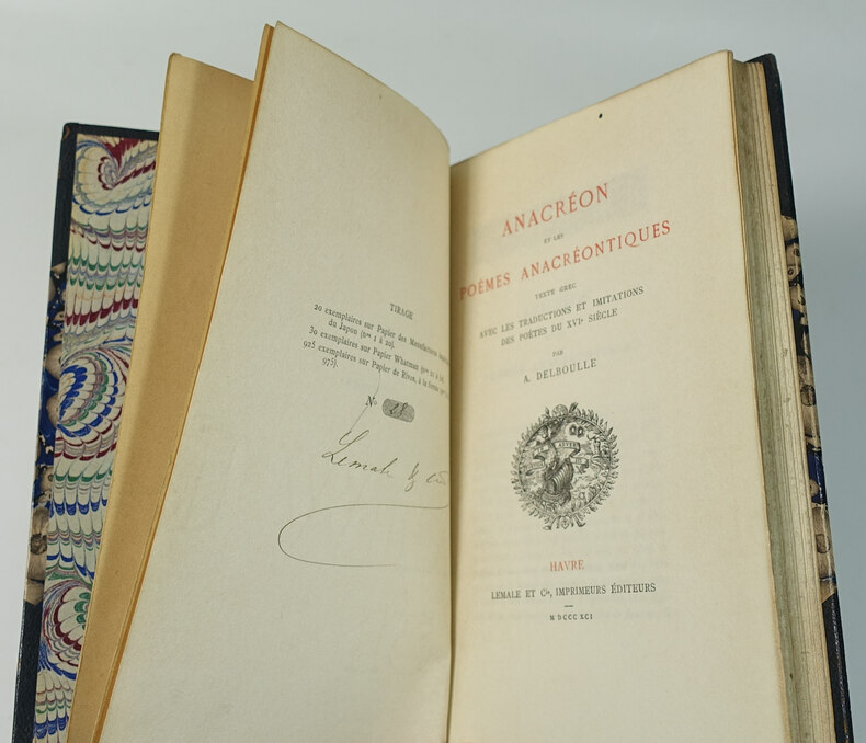 Lemale & Cie., 1891. In-12 demi-chagrin à coins bordé de filets dorés, dos à cinq nerfs sertis de filets dorés et ornés de doubles caissons dorés décorés de motifs floraux, nom, titre et date dorés, tranche de tête dorée, 182 p. L'un des 30 exemplaires sur papier Whatman signés par l'éditeur, second papier après 20 Japon. Texte grec avec les traductions et imitations des poètes du XVIe siècle par A. Delboulle. Mors frottés, par ailleurs en bonne condition.