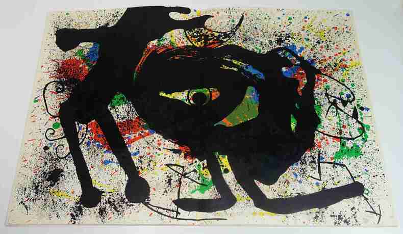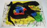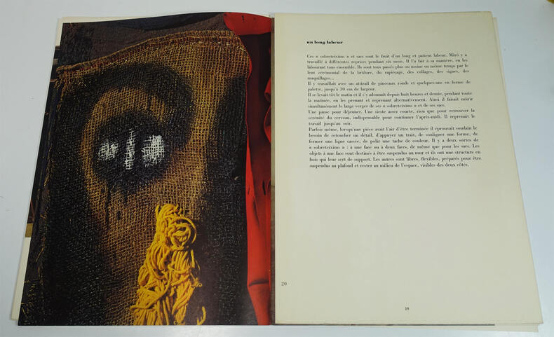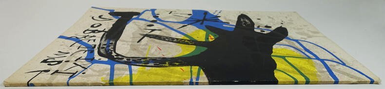 Paris Maeght éditeur, 1973. In-folio (380 x 280 mm) en feuilles, 28 pages. 3 LITHOGRAPHIES ORIGINALES en couleurs en double page, 8 reproductions en couleurs. Texte d'Alexandre Cirici "Sobreteixims et sacs". Exposition de Sobreteixims de MIRO réalisés en 1972 et 1973 avec la collaboration et dans l'atelier de Josep Royo à Tarragone.