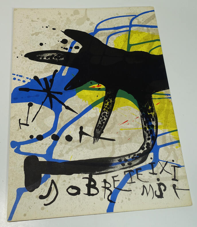 Maeght éditeur, 1973. Un volume en feuilles, 380 x 280 mm, 28 p. Edition originale. 3 lithographies originales en couleurs en double page, dont la couverture, et 8 reproductions en couleurs. DLM édité en avril 1973 pour l’exposition de Sobreteixims de MIRO à la Galerie Maeght. Texte d’Alexandre Cirici. Marques de frottements au dos, petite déchirure restaurée en bordure supérieure du premier plat, intérieur frais.