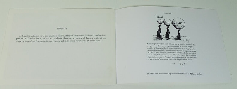 Dragée Haute, Penne-du-Tarn, dir. Noël Arnaud, 1999. Plaquette agrafée, 210 x 150 mm, pagination absente. Edition originale. 6 photographies de Thierry de Girval. Bon exemplaire.