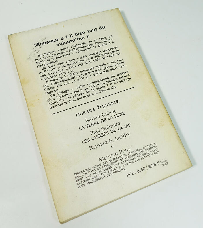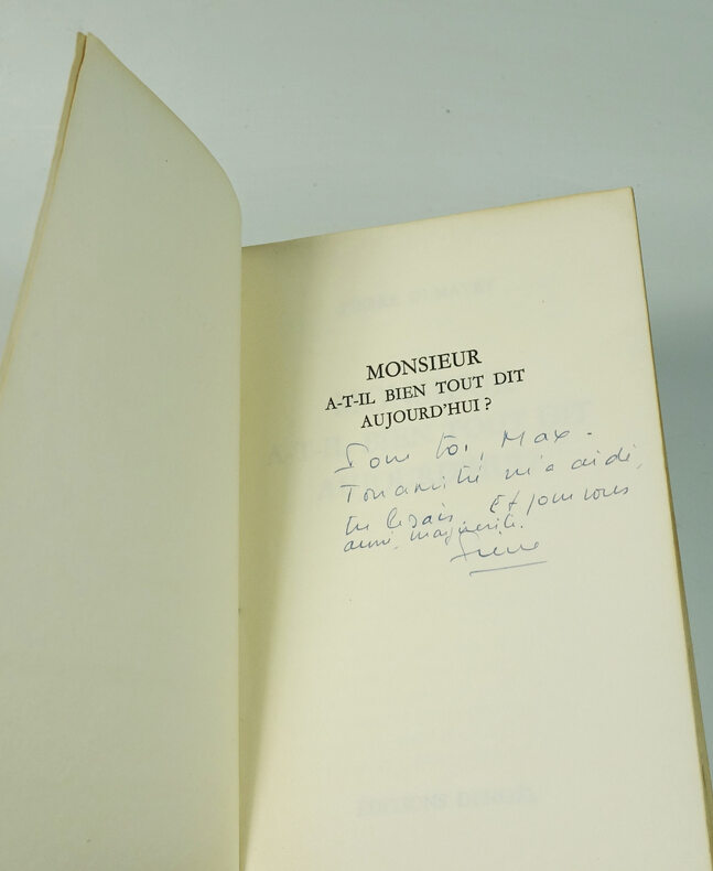 Paris Denoël 1967 1 vol. broché in-12, broché, 109 pp. Edition originale. Exemplaire du service de presse enrichi d'un envoi de l'auteur. Prière d'insérer joint. Couverture un peu poussiéreuse et salie. Sinon bon état.
