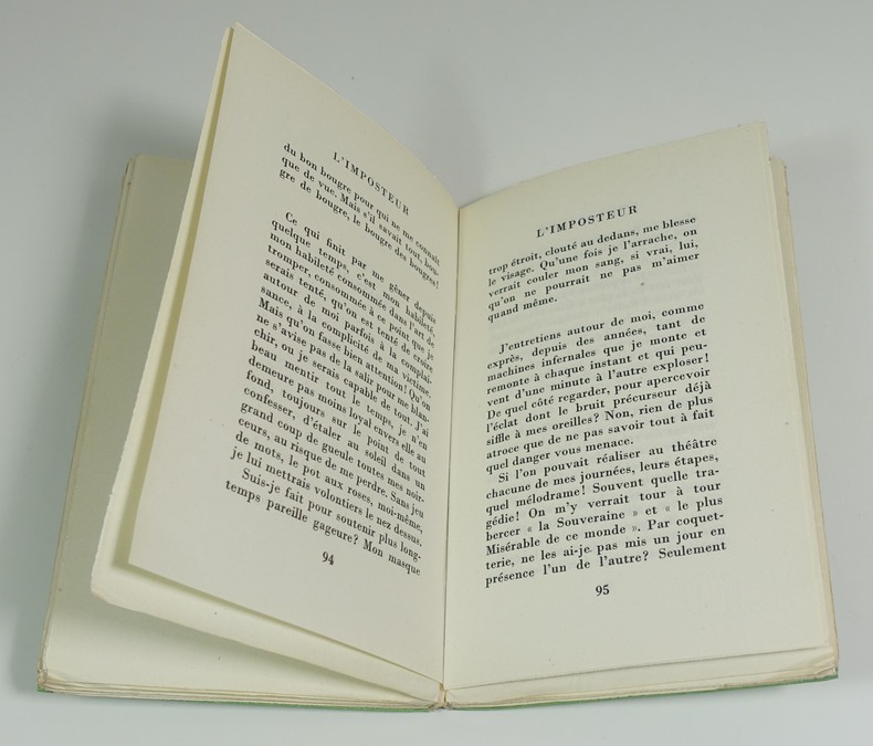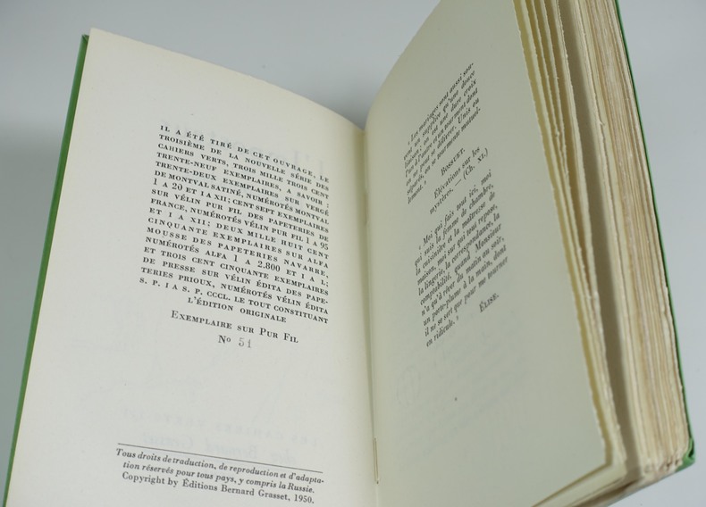 Bernard Grasset éditeur, collection "Les cahiers verts" -3-, 1950. In/8 (19 x 12 cm) broché, couverture imprimée et rempliée, 204 pages., 3 f. n. p. Frontispice dessiné par Jean Cocteau. Exemplaire numéroté sur Alfa (N°136).