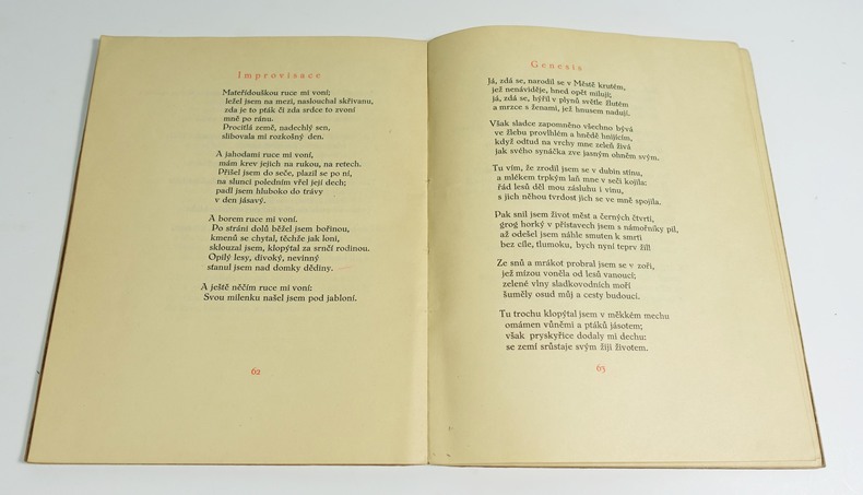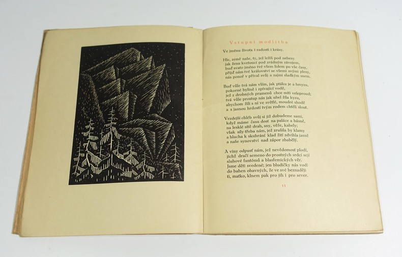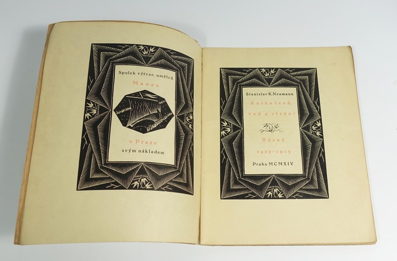 Praha, Manes, 1914. In-8 broché, 88 p. Edition originale tchèque. Bois originaux d'inspiration cubiste et typographie de Jaroslav Benda, impression en deux tons. Couverture légèrement passée, intérieur frais.