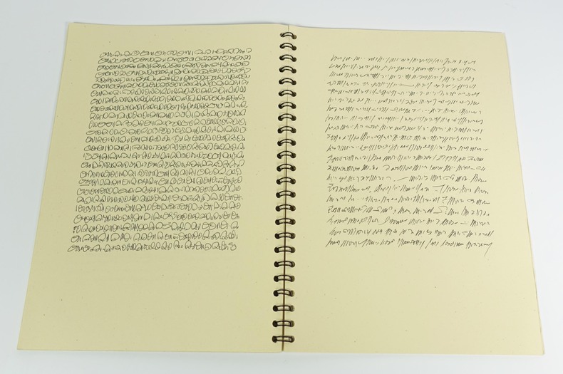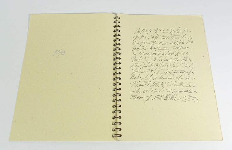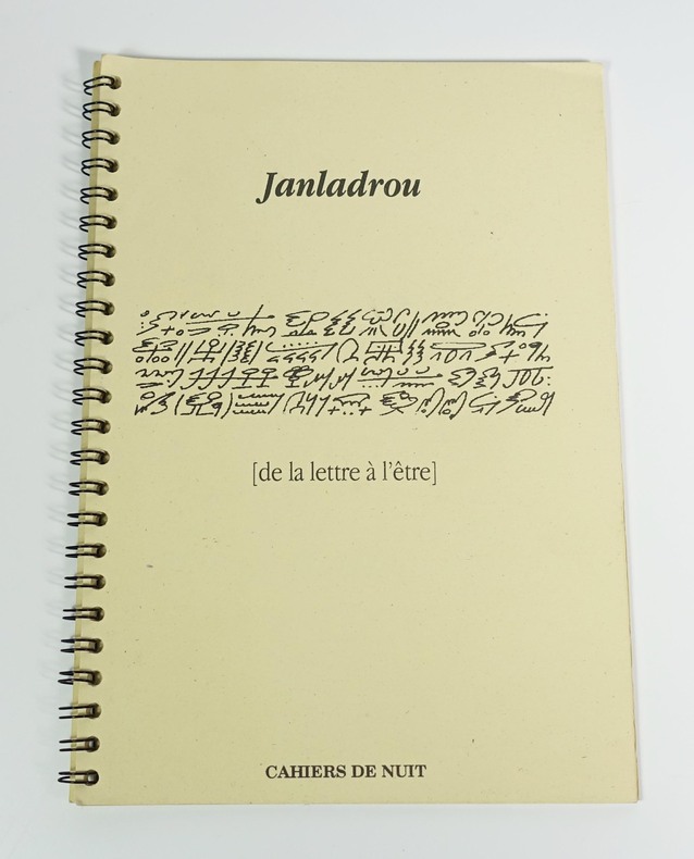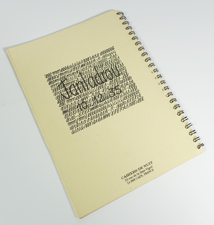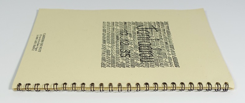 Cahiers de nuit, Caen, s.d. Reliure à spirale, 210 x 150 mm, pagination absente. Edition originale tirée à 50 exemplaires. Texte composé de logogrammes. Très bon état.