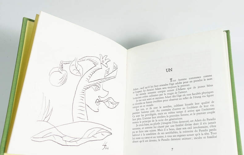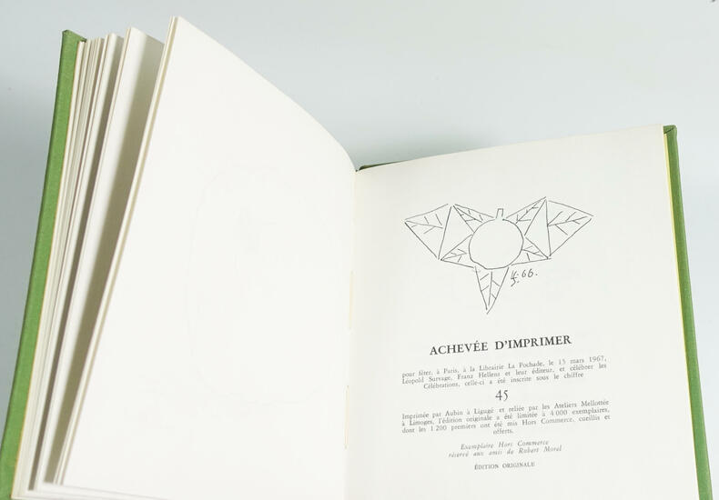 Robert Morel éditeur, 1967, Célébration n°45. In/12 carré, 48 pages, reliure pleine toile verte, titre et illustration à froid sur le plat supérieur, gardes jaune, illustrations dessins de Léopold Survage.