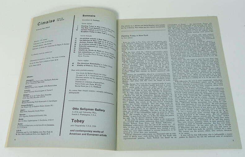 Cimaise, Paris, mai-juin 1957. Fascicule agrafé, 200 x 248 mm, 50 p. Edition originale. Couverture de Luis Feito. Textes anglais et français de Pierre Restany sur Tal Coat, Herta Wescher sur Denise Colomb, Dore Ashton, Michel Ragon sur Marta Pan, Julien Alvard sur Benrath, Jean-Robert Arnaud sur Frankie des Batignolles, etc. Illustrations en noir et blanc. Prix biffé sur la couverture inférieure sinon très bon état.