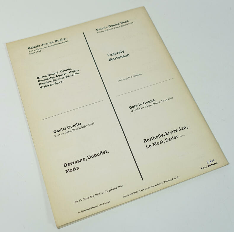 Cimaise, Paris, septembre-octobre 1956. Fascicule agrafé, 200 x 248 mm, 46 p. Edition originale. Couverture de Ania Staritsky. Textes en anglais et français de R.V. Gindertael sur Hans Hartung, Herta Wescher sur la biennale de Venise, Julien Alvard sur Van Haardt, Michel Ragon sur Sugaï et le premier festival de l'art d'avant-garde. Illustrations en noir et blanc. Prix biffé sur la couverture inférieure, sinon très bon exemplaire.