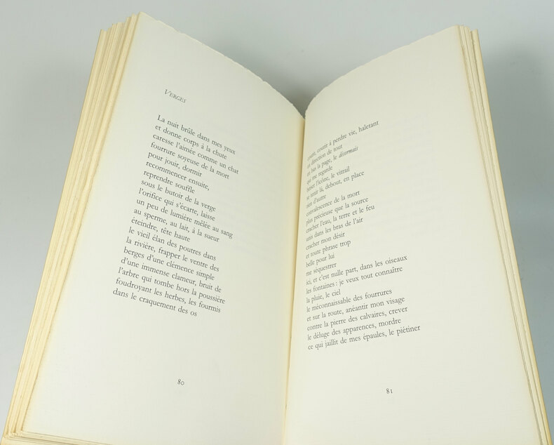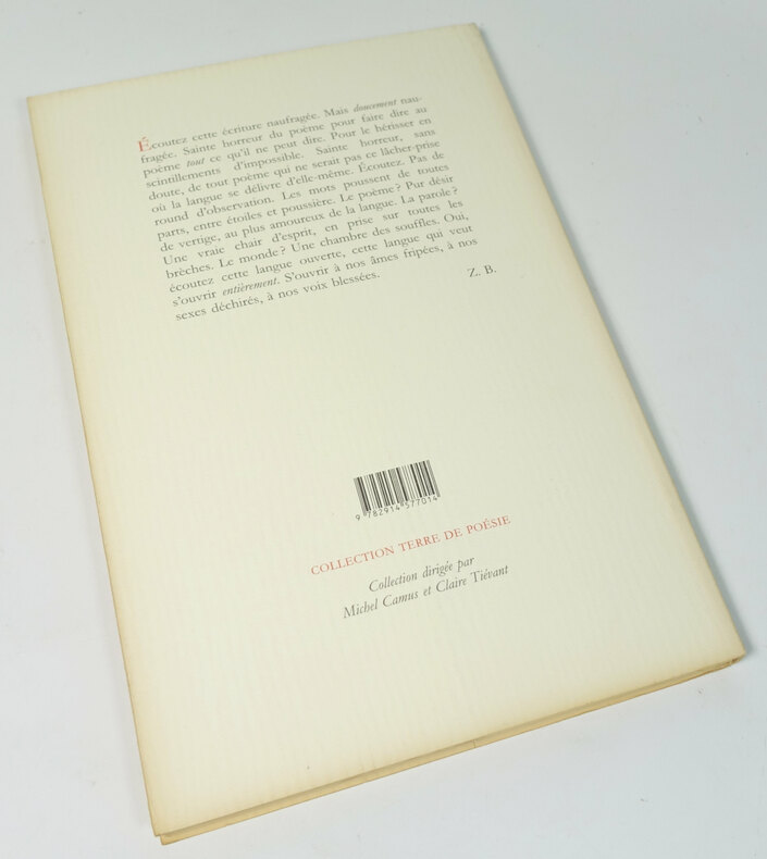 Editions Lettres vives, coll. "Entre 4 yeux", 2001. In-8 broché, 95 p. Edition originale sur papier courant. Frontispice de Claude Viallat. Préface de Zéno Bianu. Non coupé. Couverture partiellement brunie.