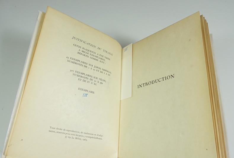 Editions Le Bélier, 1963. In-8 broché, couverture rempliée, 37 p. Edition originale. L'un des 23 exemplaires numérotés sur Japon impérial, tirage de tête suivi de 977 exemplaires sur vélin. Introduction de Pascal Pia. Bon exemplaire, non coupé.