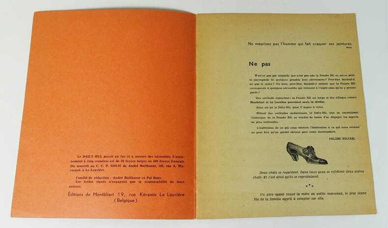 Editions de Montbliart, La Louvière, mars 1957. Plaquette agrafée, 172 x 208 mm, 10 p. Comité de rédaction : André Balthazar et Pol Bury. Edition originale au tirage non précisé. Illustrations dans le texte en noir et blanc. Quelques discrètes taches sur les plats, intérieur bon.
