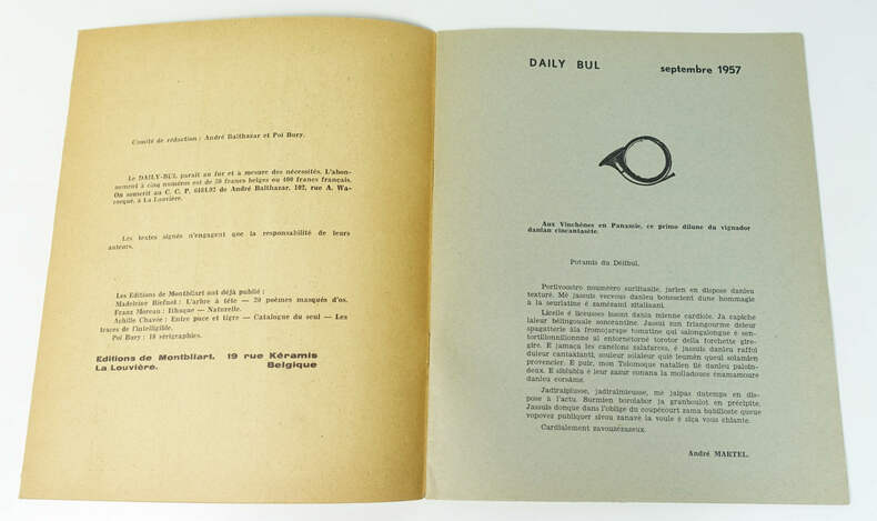 La Louvière, Editions de Montbliart, septembre 1957. Comité de rédaction : André Balthazar et Pol Bury. Plaquette agrafée, 21,3 x 17,6 cm, 8 p. Edition originale. Très bon état.