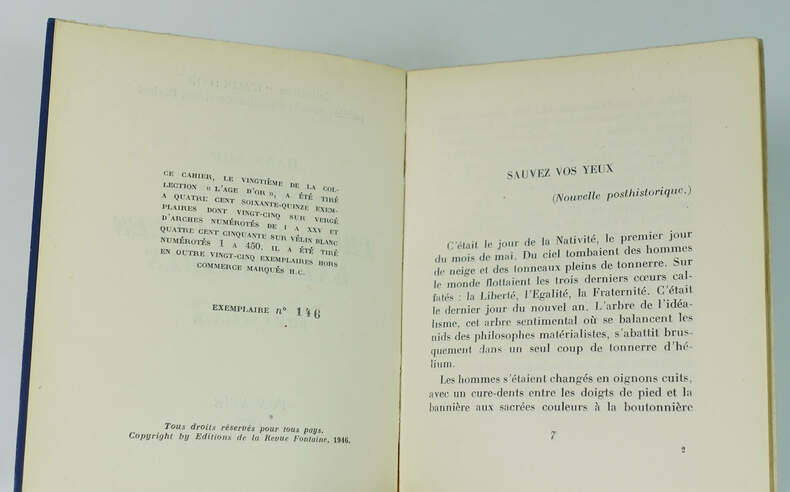 Paris Fontaine 1945 50 pp. In-16 carré. Broché. En bon état. 1 volume. Collection "L'âge d'or" n°20, dirigée par Henri Parisot.ÉDITION ORIGINALE. Un des 450 exemplaires numérotés sur vélin blanc.