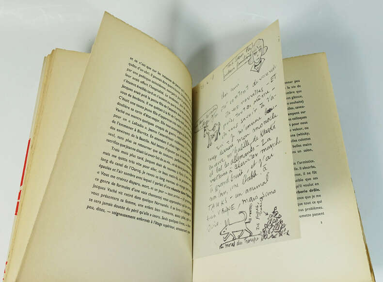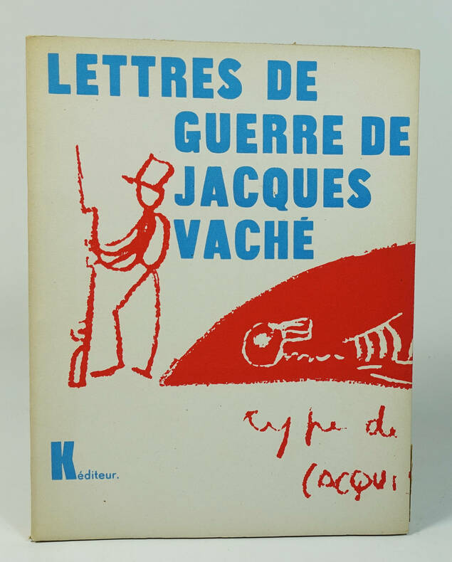 Paris, K éditeur, 30 avril 1949, in-12, non paginé, environ 70 pp, broché, couverture rempliée imprimée, Édition en partie originale, exemplaire non justifié. Complet du bandeau "préfaces d'André Breton". Recueil de lettres de Jacques Vaché envoyées à André Breton, Théodore Fraenkel, Louis Aragon et Harry James alors qu'il était au front, ou en prison. Ces lettres sont précédées de quatre préfaces d'André Breton, grand ami de Vaché, qui eut une profonde influence sur lui et sur le mouvement surréaliste. Breton écrira à propos de ces lettres de guerre qu'elles sont "une magnifique introduction à tout ce qui recouvre l'étiquette Dada. Il y a là tous les manifestes qu'on voudra, pas une négation ne manque" dans une lettre à Jacques Doucet datant du 4 janvier 1921. En fin d'ouvrage, l'article L'Opium, extrait de L'Express de l'Ouest du 9 janvier 1919, reproduit en fac-similé, dans lequel est annoncée la mort de Jacques Vaché et de l'un de ses amis, à la suite de l'absorption d'une trop forte dose d'opium et dans lequel les deux victimes sont présentées à la fois comme de "jeunes écervelés" sans expérience de la drogue ainsi que comme "de braves soldats qui avaient fait leur devoir devant l'ennemi et avaient été blessés". L'ouvrage contient aussi un fac-similé d'une lettre d'Harry James. Bel exemplaire. Couverture rigide