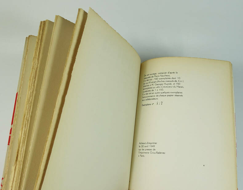 1949 broché grand in-octavo carré (paperback in-octavo), dos gris imprimés (grey spine and cover printed), couverture illustrée en couleurs (front cover illustrated in colours), tranches non rognées (edges no smooth), pages de garde marrons clairs (brown endpapers), page de faux-titre (half title page), illustrations : 1 lettre et 1 extrait d'article de journal en fac-similé (a letter and extract of article of newspaper), sans pagination (unpaginated) - 77 pages, 1949 à Paris K Editeur - Imprimerie de Gou-Radenez,