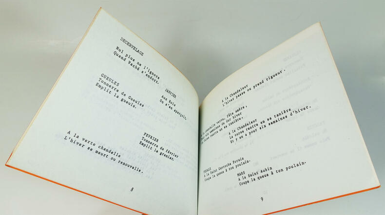 Coll. "des Phynances" n° 5, Paris, éd. Collège de 'Pataphysique, 9 clinamen 102 - 31 mars 1975, EDITION ORIGINALE expl. isothermiques n° 63/333 sous couverture capucine, in-8 oblong, br. couv. texte en noir sur fond orange éd., 20 - (4) pp., Un "projet de mettre en accord le temps avec le temps et traduire le corpus des dictons météorologiques et agricoles des dates du calendrier vulgaire à celles du calendrier pataphysique". Réf. Scalaire 109. Pas courant. Très bon état