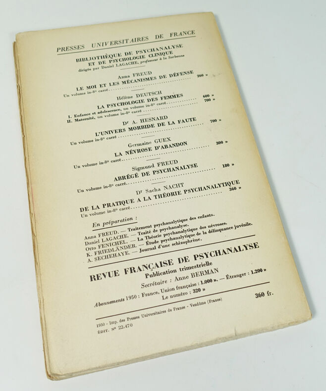 P.U.F., coll. "Bibliothèque de psychanalyse et de psychologie clinique", 1950. In-8 broché, 161 p. Edition originale sur papier courant. Dos légèrement bruni, sinon en bonne condition.