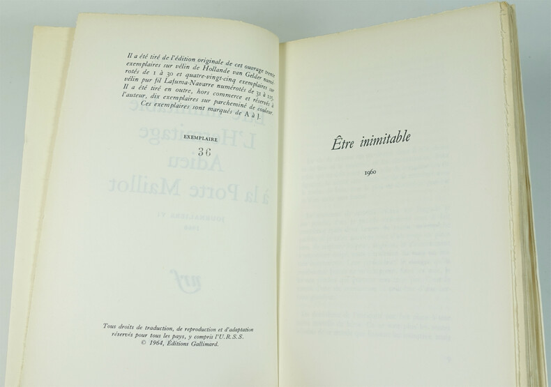 Gallimard, Nrf, 1964. In-8 broché, 297 p. Edition originale. L'un des 85 exemplaires sur vélin pur fil, seul grand papier avec 30 Hollande et 10 hors commerce. Chiffre manuscrit sur la première garde, infimes taches au dos.