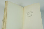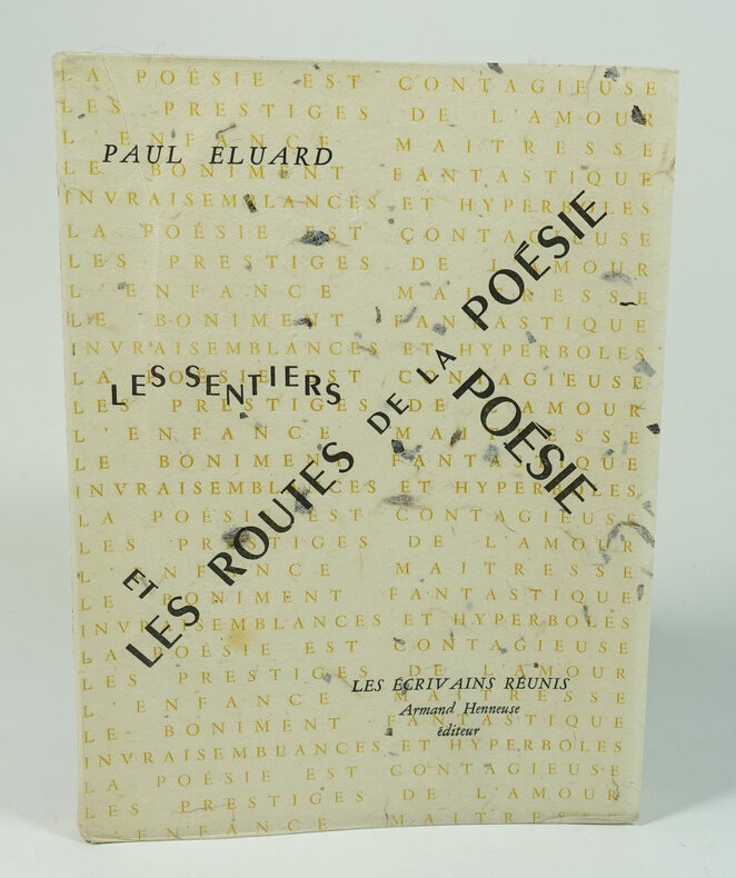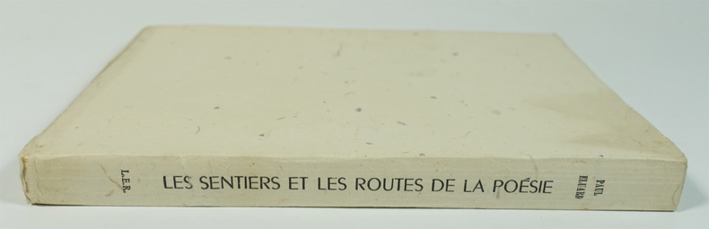 Édition originale, un des 15 exemplaires numérotés sur chiffon Auvergne, tirage de tête. Reliure en plein box noir, dos lisse, plats comportant une importante plaque de box blanc et gris décorée d'un jeu géométrique de filets dorés créant des perspectives, gardes et contreplats de papier Auvergne, fines couvertures et dos de papier Auvergne conservés, tête dorée sur témoins; étui à rabats de papier noir doublé de feutrine grise et dos de rhodoïd qui comporte une légère fente en tête, étui bordé de box noir et intérieur de papier marron, spectaculaire reliure signée Pierre-Lucien Martin. Notre exemplaire est enrichi d'un feuillet manuscrit comportant six fragments de poèmes choisis et recopiés par Paul Eluard qui parurent dans Poésie et vérité dix ans plus tôt. Magnifiqueexemplaire remarquablement établi dans une reliure en plein box à décor de Pierre-Lucien Martin. - Photographies et détails sur www.Edition-Originale.com -