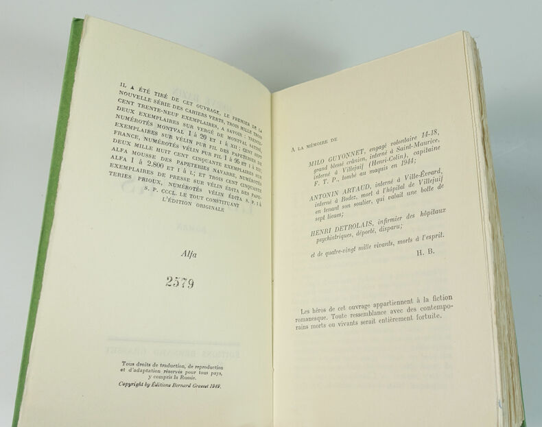 Bernard Grasset, coll. "Les Cahiers verts", 1949. In-8 broché, 402 p. Edition originale numérotée sur alfa. Plis au dos, frottements aux coins du dos.