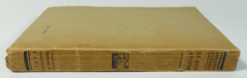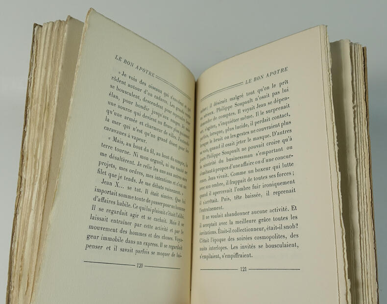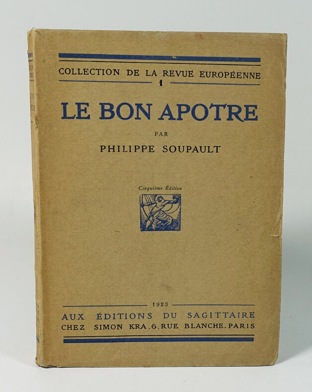 Paris Editions du Sagittaire, "Collection de la Revue Européenne" 1923 1 vol. broché in-16, broché, 218 pp. Edition originale sans mention. On joint 3 lettres adressées par l'auteur en 1923 à Daniel Halévy (dont 2 dactylographiées sur papier à en-tête de la collection de la "Revue Européenne"). Soupault remercie son correspondant de l'intérêt qu'il manifeste à l'égard du "Bon Apôtre" mais il ne pourra pas donner ce roman aux "Cahiers Verts" puisqu'il est déjà engagé au Sagittaire.