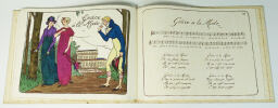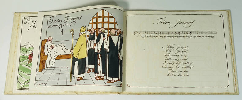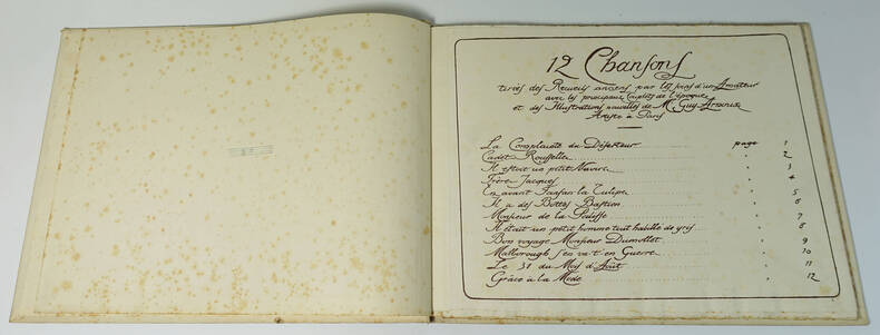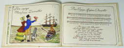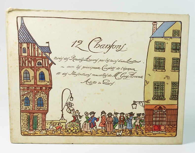 0 Sans lieu ni date ( vers 1920) - In4 oblong , cartonnage illustré et aquarellé au 1er plat d'une composition de Guy Arnoux - 26 pages doubles montées sur onglets . 12 illustrations hors texte de Guy Arnoux lithographiées en bistre et coloriées au pochoir avec en regard le texte et la portée musicale des chansons ; tout petit accroc a la coiffe supérieure sinon trés bel exemplaire . Rare premier tirage sur papier vergé à la forme imprimé d'un seul coté sans nom d'imprimeur.