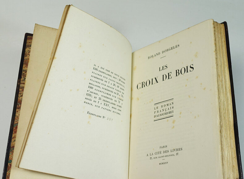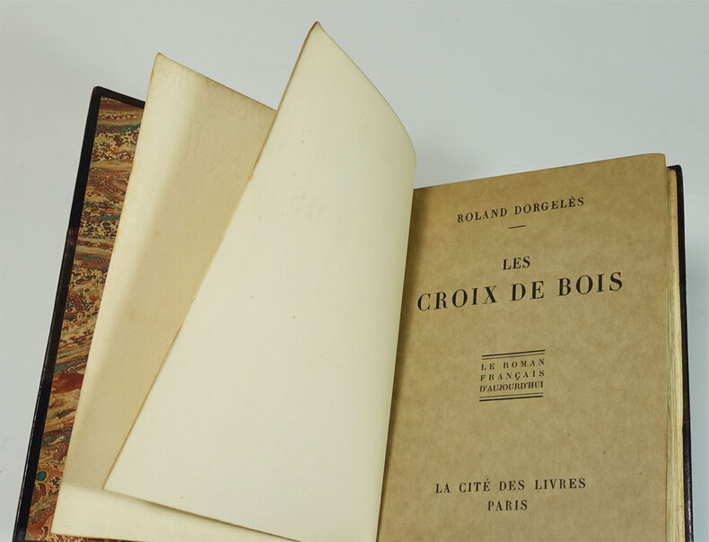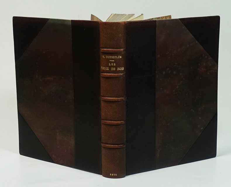 avec un portrait à l'eau forte par G.Gorvel d'après le tableau d’Émile Charmy Édition numéro 1116 sur papier du Marais Les Croix de bois est un roman publié par Roland Dorgelès en 1919 aux Éditions Albin Michel, inspiré de l'expérience vécue par son auteur durant la Première Guerre mondiale, et raconte le quotidien des soldats de l'armée française durant la Première Guerre mondiale. Le long des chemins du front, on trouvait souvent une ligne à perte de vue de croix de bois, faites à la va-vite, et posées au-dessus des cadavres de soldats allemands ou français. Soldats inconnus, jeunes soldats, c’est en leur hommage que Dorgelès écrit ce livre, c’est pour leur souvenir, leur mémoire. vol. relié jolie reliure, 23x15, très bel exemplaire, tranche de tête dorée, 225pp + catalogue, cachet du relieur Maertens, Couvertures d'origines conservées avec dos Édition G. Crès & Cie, 1923 ref/50