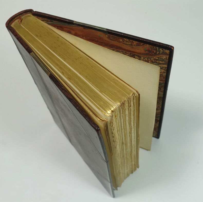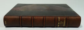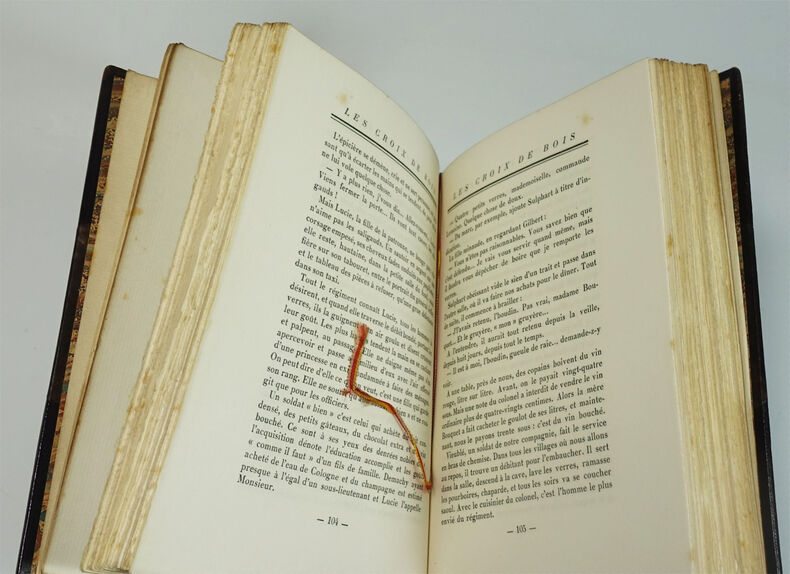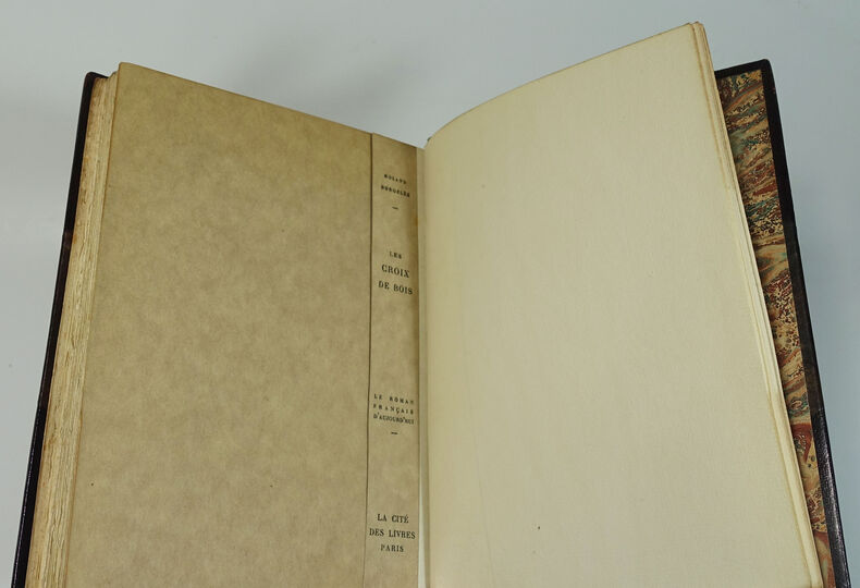 Roland Dorgelès et Charles Fouqueray (illustrateur), Les Croix de Bois [suivi de] La Boule de Gui. Paris, imprimé pour les membres du cercle Grolier, 1925. In-4, 283-99p. Magnifique édition illustrée de 166 gravures de Fouqueray, dont 28 hors-texte. Tirage numéroté à 300 exemplaires, le nôtre un des 25 exemplaires mis dans le commerce, a priori tous sur arches (cette édition est largement hors commerce) . Il y eut ensuite un tirage supplémentaire au-delà du numéro 300. L'ouvrage fut donc imprimé pour les membres du cercle Grolier dont Charles Meunier est le fondateur. Retraité de la reliure, il n'en fut pas moins actif comme le montre cette édition qu'il a dirigée. Reliure parlante : le cuir imite le bois et le décor permet clairement de montrer des croix de bois ! Néanmoins, cette reliure est, curieusement, non signée. Elle ressemble toutefois à certains travaux de Kieffer. Plein maroquin brun, dos lisse, décor de filets dorés et à froid dessinant notamment des croix ombrées sur les plats, petits cercles mosaïqués noirs aux croisements des filets dorées ou rouges au centre des croix, maroquin encadrant les contreplats avec filets dorés et à froid, contreplats et gardes moirées, non rogné, tranches dorées sur témoins, couvertures et dos conservés pour chacun des deux titres, chemise demi-maroquin à bandes et à rabats doublée de basane, étui bordé. Reliure en parfait état, charnières intérieures de la chemise ouvertes mais la chemise reste néanmoins solide. Magnifique exemplaire.