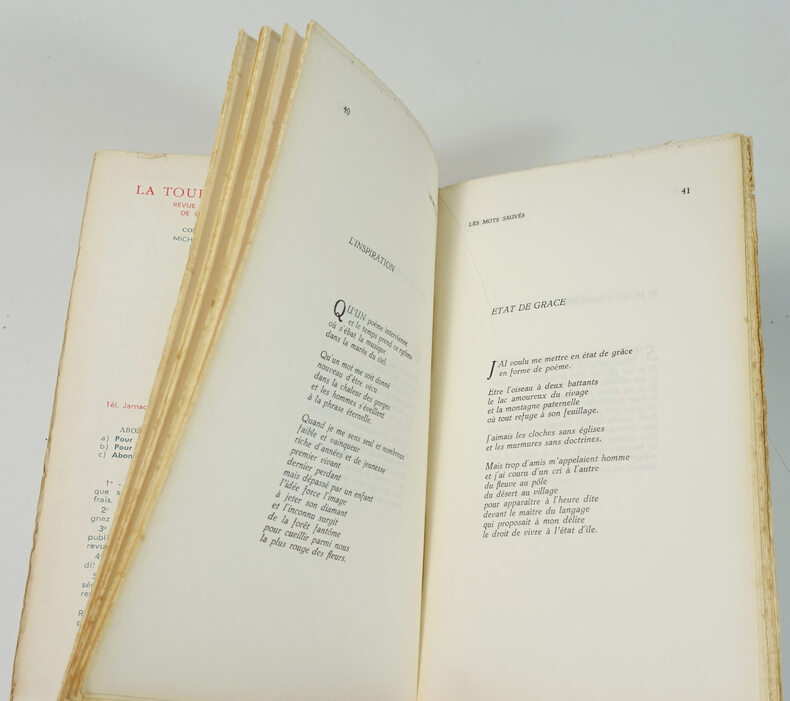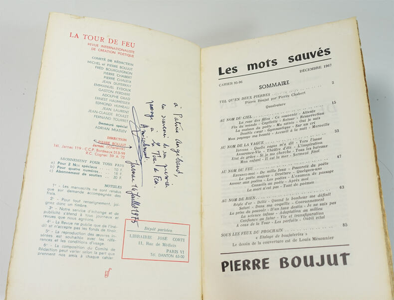 Jarnac, Dir. Pierre Boujut, décembre 1967. In-8 broché, couv. de Louis Mésonnier, 96 p. Edition originale enrichie d'un envoi autographe signé de Pierre Boujut au poète Patrice Angibaud. Couverture passée, dos bruni avec accroc restauré en tête, petite déchirure en bordure supérieure du premier plat.