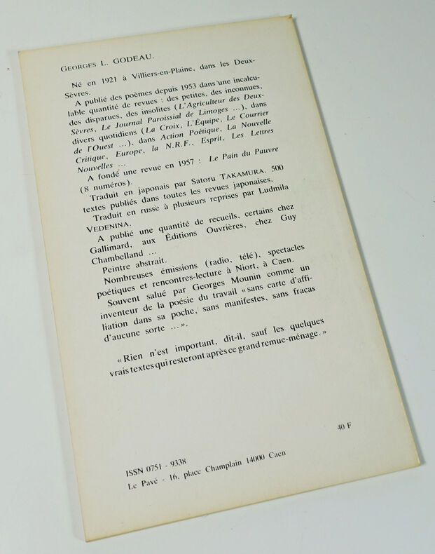 Le Pavé, Caen, 1984. In-12 broché, couverture illustrée et ajourée, 62 p. Edition originale sans grand papier. Marques de brunissement aux bordures du premier plat, sinon bon état.