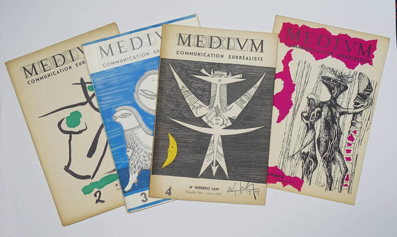 Paris, Médium, 1953-1955, dir. Jean Schuster. 4 volumes in-4 brochés, couvertures illustrées par illustrées par Hantaï, Paalen, Svanberg, Lam. Edition originale. Collection complètes de la nouvelle série. Nombreuses illustrations. Discrètes traces du temps, très bon ensemble par ailleurs.