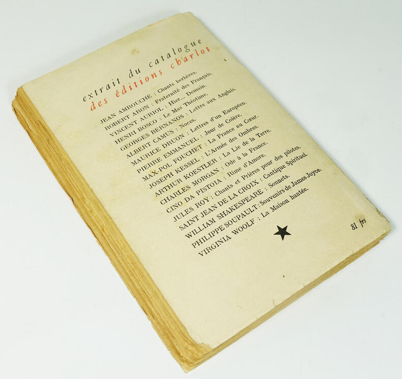 Charlot, 1945. In-12 broché, 189 p. Edition originale dont il n'est pas fait mention de grands papiers. Couverture passée, dos gauchi, papier jauni.