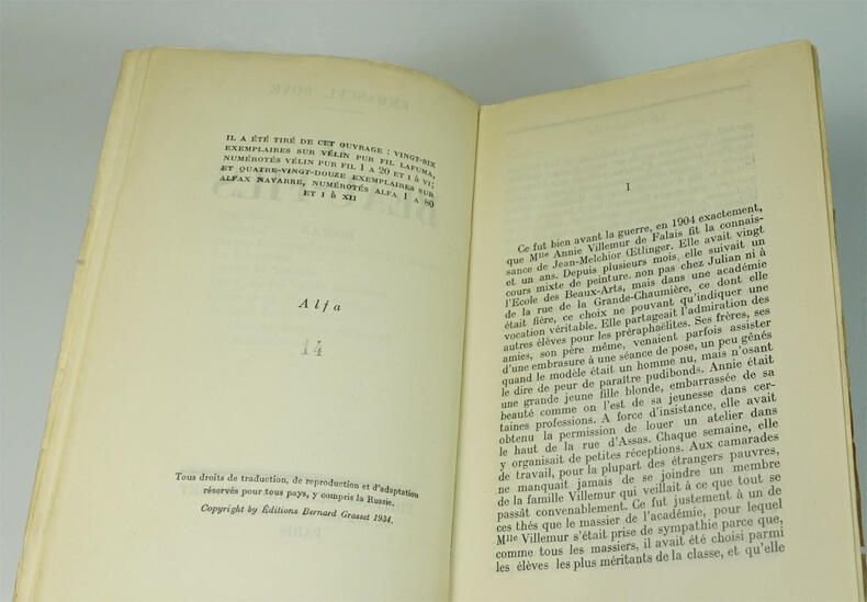 Bernard Grasset, 1934. In-8 broché, 373 p. Edition originale. L'un des 92 exemplaires sur alfax Navarre, second papier. Quelques taches et plis sur la couverture, mors inférieur restauré, petits manques en bordure du second plat, intérieur bon.