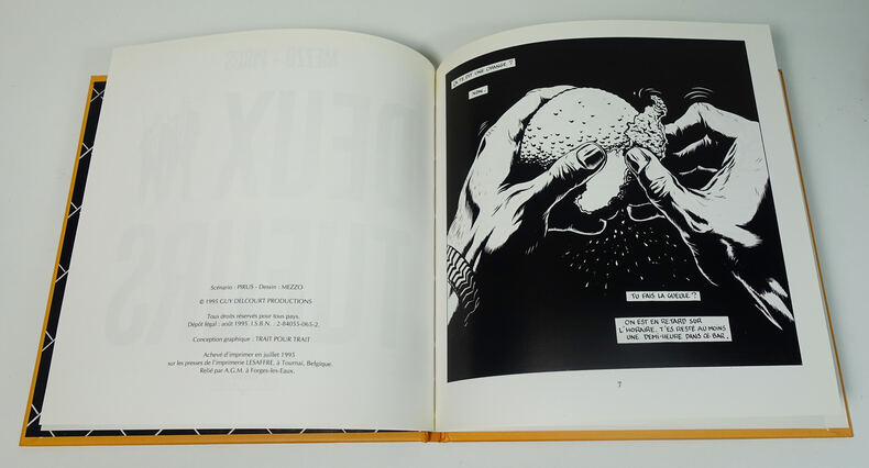 Delcourt, 1995. Album cartonné d'éditeur, 230 x 230 mm, 56 p. Planches en noir et blanc. Pli dû à un défaut de fabrication au coin du second plat, sinon très bon état.