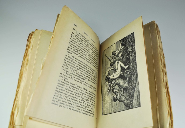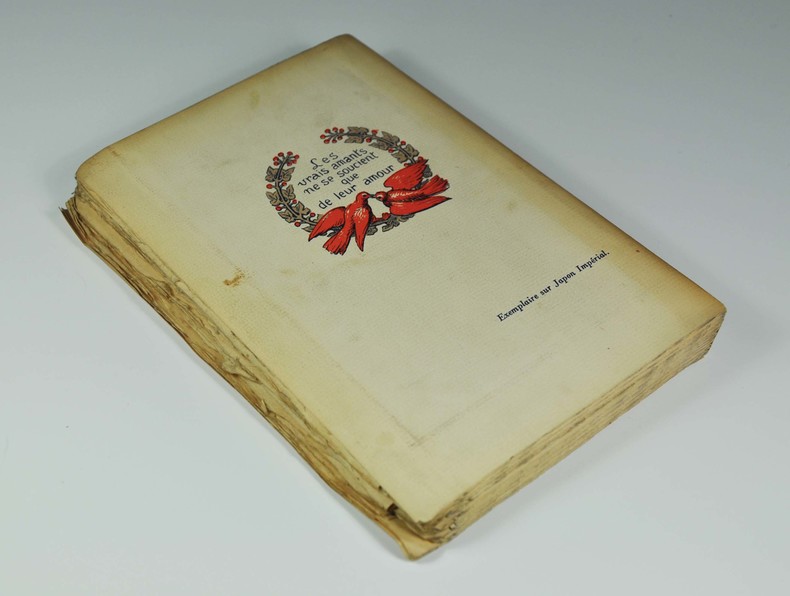 A l'enseigne du Pot cassé, coll. "Bibliotheca - Magna", 1939. In-8 broché, couverture illustrée, à toutes marges, 252 p. L'un des 60 exemplaires sur Japon impérial, premier papier. Les illustrations ornant ce volume sont la reproduction des gravures de Marc-Antoine, d'après les fresques originales de Raphaël, pour l'Âne d'or d'Apulée, perdues depuis. Couverture passée, exemplaire légèrement gauchi, intérieur impeccable. Découronné.
