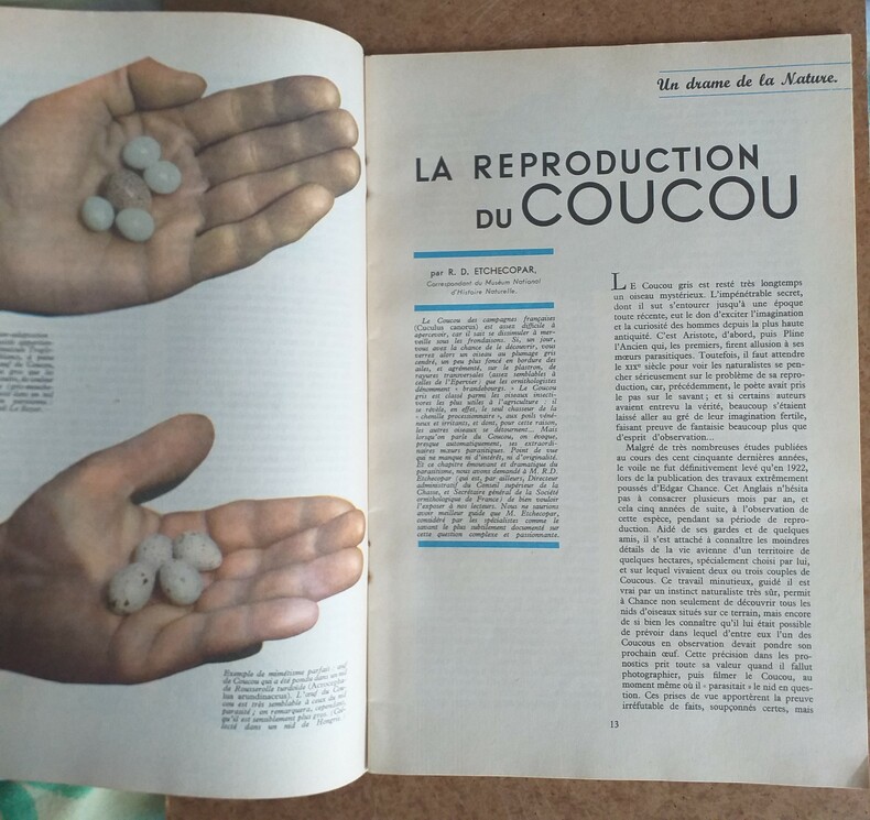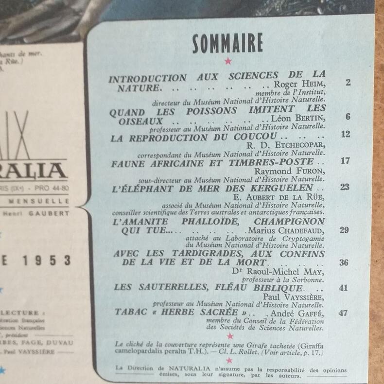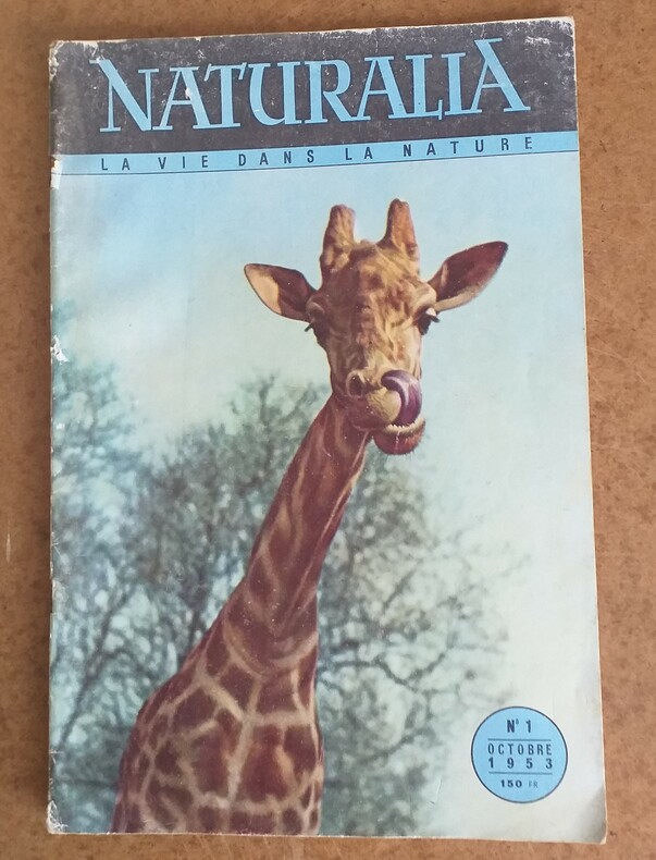 Publication mensuelle--48 pages--Total de 8 pages--Numéro 1 de octobre 1953--Sommaire : introduction aux sciences de la /- quand les poissons imitent les oiseaux /- la reproduction du coucou / - faune africaine et timbres poste /-l'éléphant de mer des Kerguelen /- l'amanite phalloïde, champignon qui tue.../- avec les tardigrades aux confins de la vie et de la mort /- les sauterelles, fléau biblique /- tabac "herbe sacrée"----Bon état intérieur--Couverture légèrement usagée sur les contours et désolidarisée du reste, coin plié à l'arrière et auréole sur une petite partie