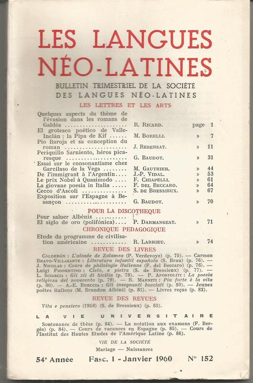 Bulletin trimestriel de la société des langues néo-latines -- Revue de 92 pages---Certains textes sont en français et d'autres en espagnol---------------------------------------SOMMAIRE /Quelques aspects du thème de l'évasion dans le romans de Galdos /El grotesco poetico de Valle-Inclan : la Pipa de Kif / Pio Baroja et sa conception du roman / Periquillo Ssarniento, héro picaresque / Essai sur le consonantisme chez Garcilaso de la Vega / De l'immigrant à l'argentin / Le prix Nobel à Quasimodo / La giovane poesia in Italia / Cecco d'Ascoli / Exposition sur l'Espagne à Besançon / Pour saluer Albeniz / El siglo de oro (polifonica) / Etude du programme de civilisation américaine