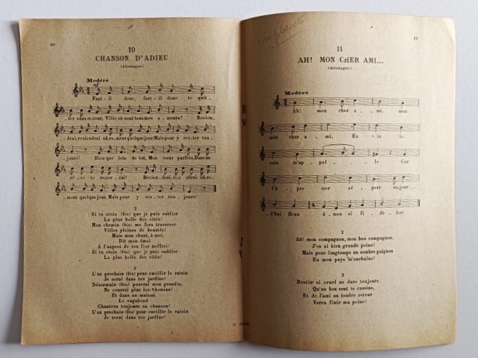 Un livre pédagogique destiné aux écoles (et aux activités périscolaires).Il rassemble des mélodies populaires traditionnelles de différents pays, adaptées pour l’enseignement du chant.--Publié sous l’égide de la Société française L’Art à l’École, dans un objectif éducatif et culturel.--Édition : Édité à Paris, chez Au Ménestrel / Heugel, un éditeur musical très connu.--Le style et la présentation indiquent une publication fin XIXᵉ – début XXᵉ siècle--Contenu typique : Partitions musicales// Paroles (souvent traduites ou adaptées en français)//Destiné aux enseignants et aux chorales scolaires--Total de 21 pages, le bas des premières pages est courbé-envoi en lettre suivie moins de 100 gr
